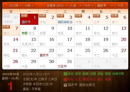 中秋節(jié)和國慶節(jié)假期合并,以下是放假安排:2012年9月29日至2012年10月7日放假調(diào)休,共9天。2012年10月8日正式上班,特此通知!