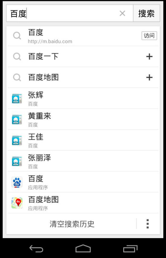 前段時(shí)間就有“百度應(yīng)用內(nèi)搜索功能”上線的消息爆出,但我發(fā)現(xiàn)似乎并不是這么一會(huì)事,我試用了一下發(fā)現(xiàn),現(xiàn)在的“應(yīng)用內(nèi)搜索”還無法真正抓取應(yīng)用內(nèi)的數(shù)據(jù),而是通過搜索對(duì)本地App進(jìn)行搜索調(diào)用或推薦相關(guān)的App供我下載(貌似只是名稱相關(guān))。例如我在百度應(yīng)用內(nèi)搜索“百度”Web搜索外,還會(huì)出現(xiàn)我存在通訊錄中和“百度”相關(guān)信息的聯(lián)系人以及百度的應(yīng)用,我可以直接點(diǎn)擊調(diào)用它們,這僅僅是實(shí)現(xiàn)“應(yīng)用內(nèi)搜索”的第一步,最重要的還是實(shí)現(xiàn)應(yīng)用內(nèi)數(shù)據(jù)的抓取和理解。