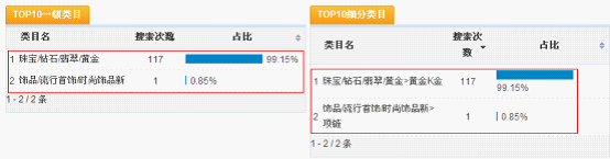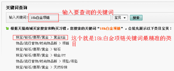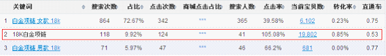 由圖上可以看出寶貝類目是黃金/黃金,搜索18k白金項(xiàng)鏈總搜索量是117,寶貝類目是項(xiàng)鏈時(shí),搜索18k白金項(xiàng)鏈總搜索量是1。