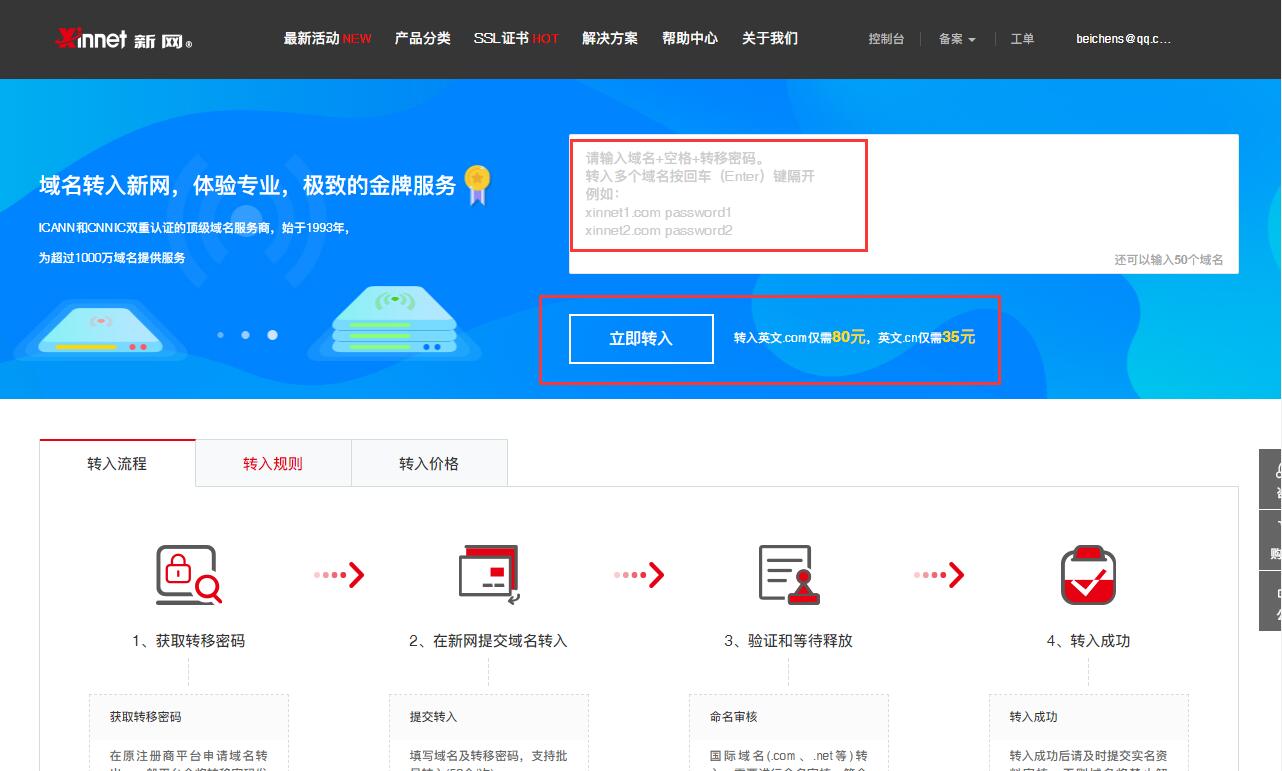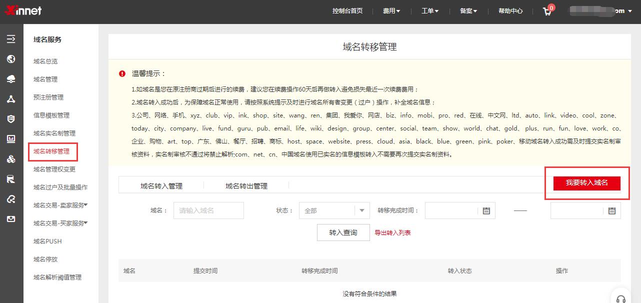 按照以上提示操作即可,獲取了轉移密碼以后,需要再登錄新網域名管理平臺進行轉入操作,如下圖所示: