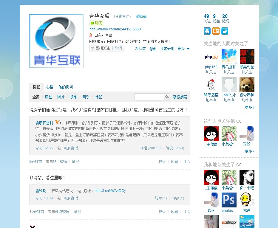青島網(wǎng)站建設(shè)青華互聯(lián)也認(rèn)為:必須也加入到新浪微博的隊(duì)伍中來,跟得上時(shí)代,跟得上潮流。