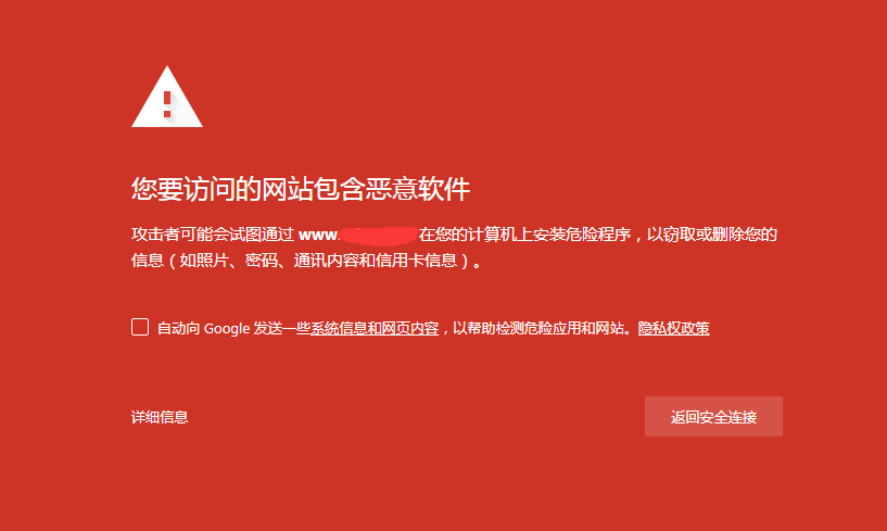 今天有個朋友向我咨詢,他的站點在用谷歌瀏覽器訪問時提示“您要訪問的網(wǎng)站包含惡意軟件”,而是用其他的瀏覽器訪問顯示正常,紅通通的頁面并未讓用戶感到一絲喜慶。
